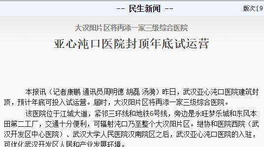 大漢陽片區(qū)將再添一家三級綜合醫(yī)院,亞心沌口醫(yī)院封頂年底試運(yùn)營!(載《長江日報》2017年3月27日第九版) 鏈接:http://cjrb.cjn.cn/html/2017-03/27/content_5601713.htm?from=groupme